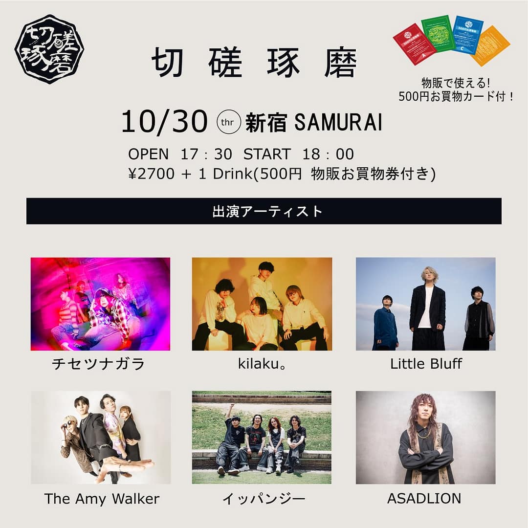 OPEN 17:30 / START 18:00 会場 新宿SAMURAI 料金 ¥2700+1dr(500円物販チケット付き) <出演者> イッパンジー / Little Bluff / チセツナガラ / The Amy Walker / kilaku。/ ASADLION