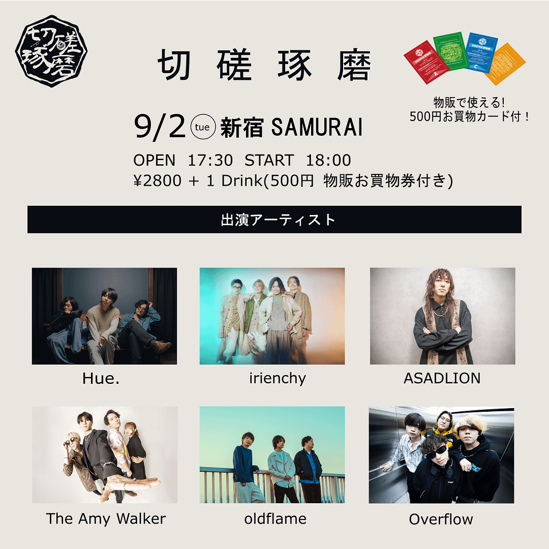 OPEN 17:30 / START 18:00 会場 新宿SAMURAI 料金 ¥2800+1dr(500円物販チケット付き) <出演者> Hue. / irienchy / oldflame / The Amy Walker /ASADLION / Overflow
